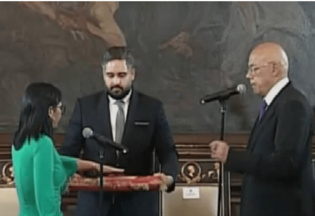 Acogiéndose a la fórmula habitual, Jorge Rodríguez, hermano de Delcy Rodríguez, ha reconocido el juramento: «Si así lo hiciere, que Dios, la patria, nuestro pueblo, os lo premio. En caso contrario, os lo demande» y ha declarado investida como presidenta encargada a Delcy Eloína Rodríguez Gómez, su nombre completo.