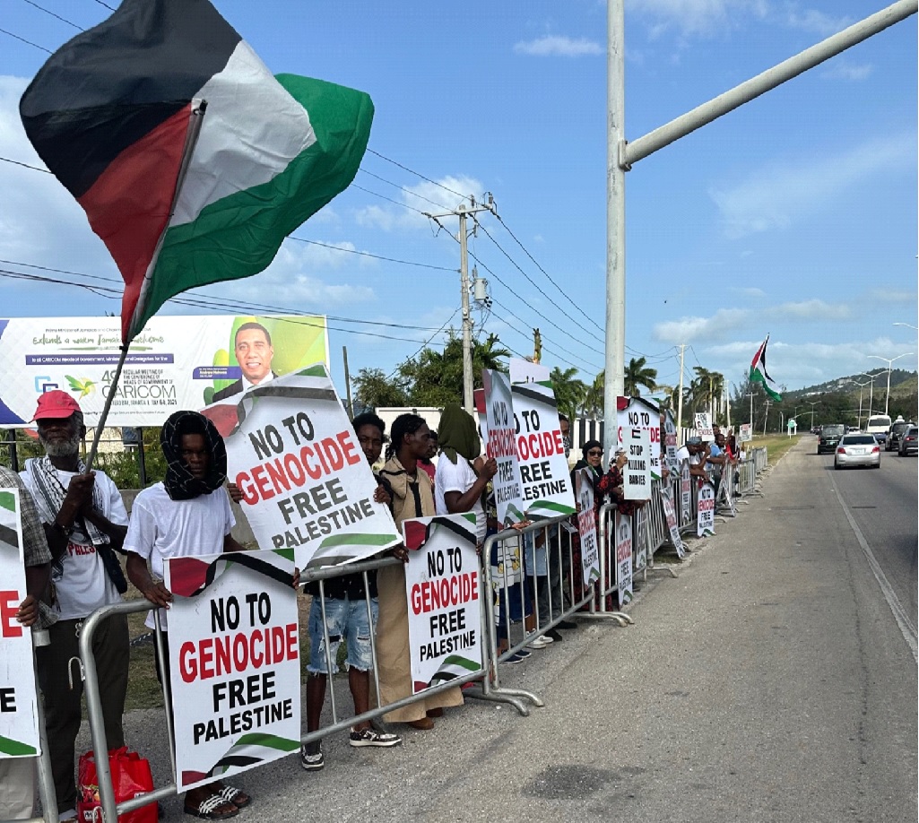 Their message was unequivocal: “Break the Silence. Boycott Israel. End the Genocide in Gaza.” Waving Palestinian flags alongside Jamaica’s black, green, and gold, and raising placards that read “NO TO GENOCIDE-FREE PALESTINE”, demonstrators formed a human chain of conscience-visible to every regional delegate entering the venue.